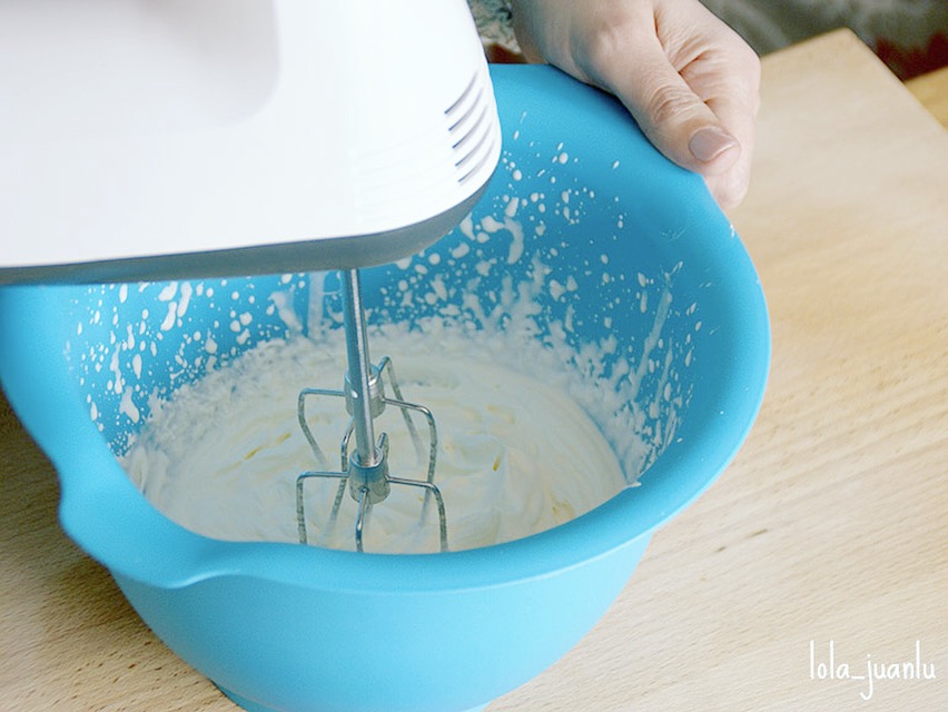 En un bol vertemos la nata (crema de leche) y la montamos con ayuda de un batidor con varillas para montar.