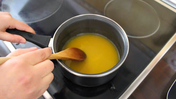 5. En un cazo, ponemos a calentar la mitad del puré de mango preparado anteriormente, después le echamos la gelatina ya hidratada y bien escurrida. Removemos rápidamente hasta que se disuelva la gelatina por completo.