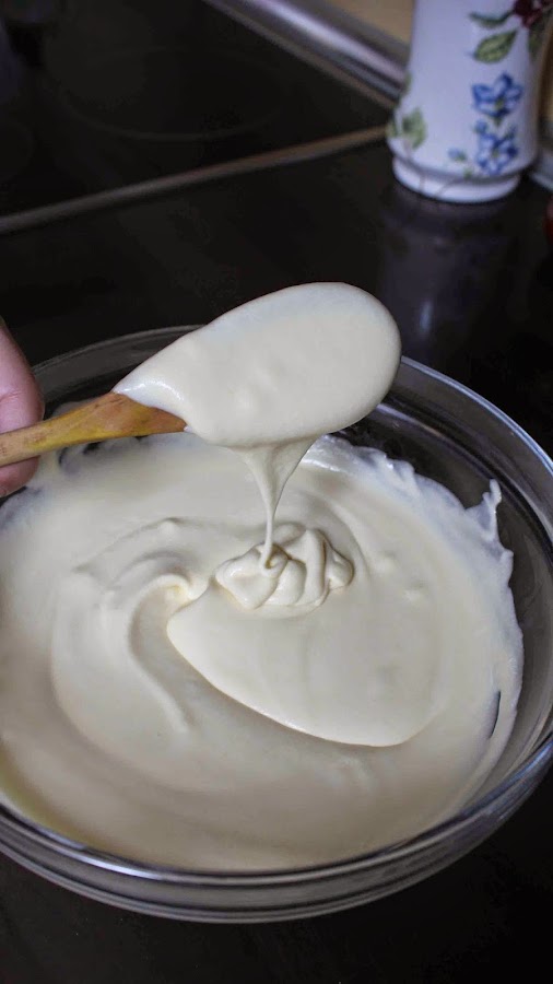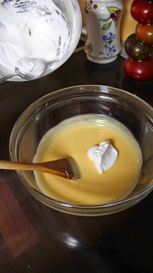 8. Ahora añadimos la nata montada (crema de leche) preparada anteriormente poco a poco y siempre removiendo de abajo hacia arriba y con suavidad.