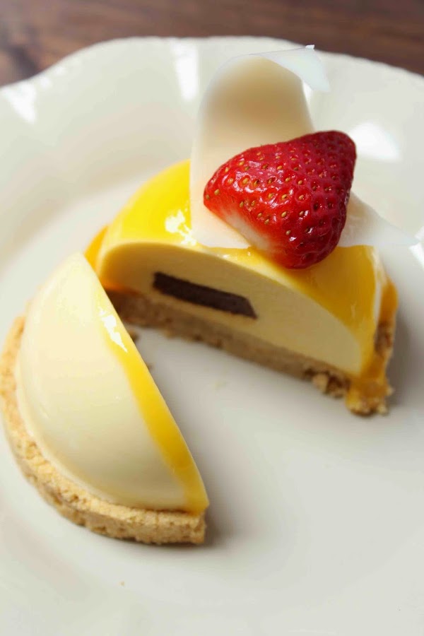 9. Ahora cogemos un molde de silicona de media esfera de unos 8 cm de diámetro y rellenamos la mitad con la mousse de mango y yogur. Ponemos en el centro un rectángulo de la ganache de chocolate reservada en el congelador (podéis poner incluso dos rectángulos) y terminamos de rellenar con más mousse de yogur y mango. Alisamos la superficie con un cuchillo o una espátula.