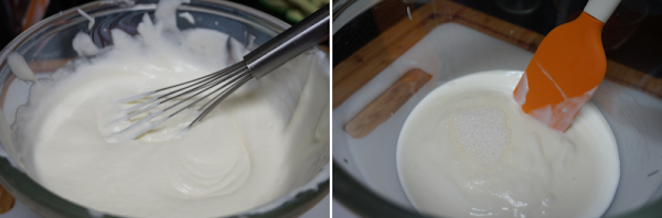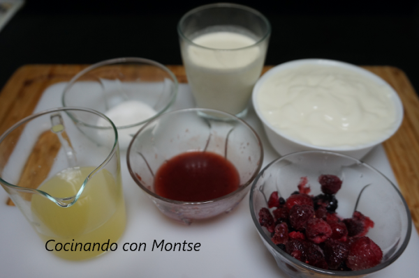 En el bol de los yogures iremos añadiendo primero la nata (crema de leche), con cuidado y movimientos suaves lo mezclamos. Seguido mezclamos las claras de huevo y hacemos lo mismo, con mucho cuidado las mezclamos para que no se bajen.