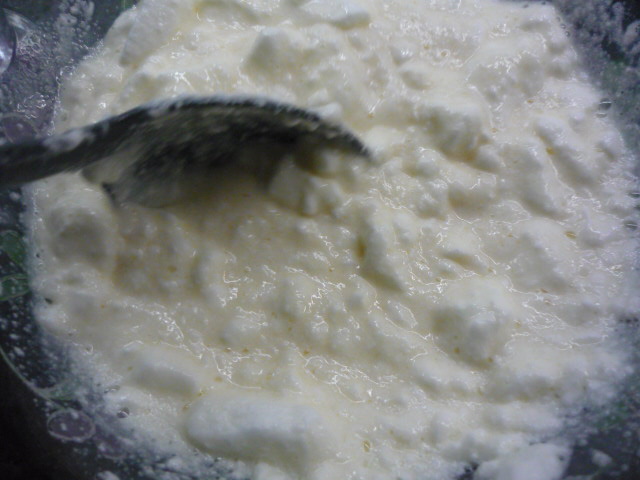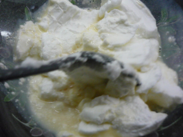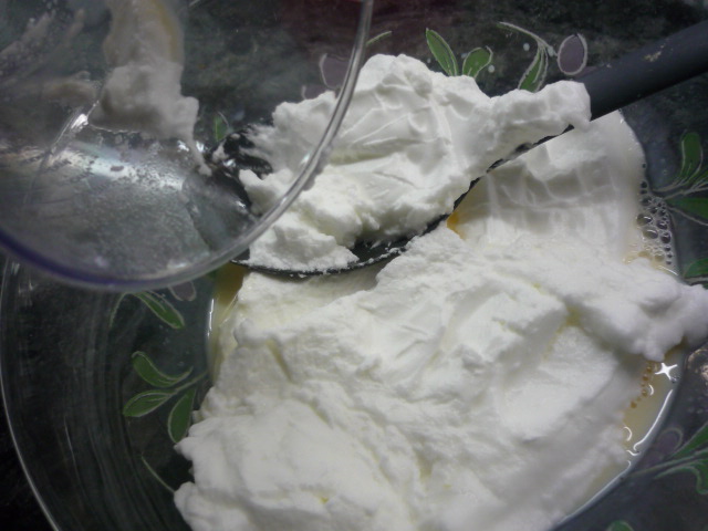 5.- Montamos las claras con una batidora de varillas y las echamos al resto de ingredientes. Mezcla suavemente, con movimientos envolventes.