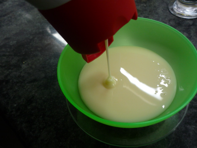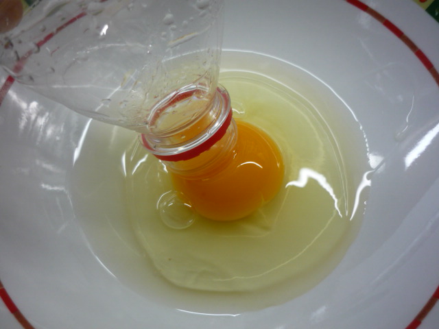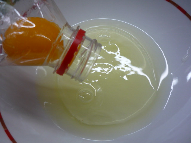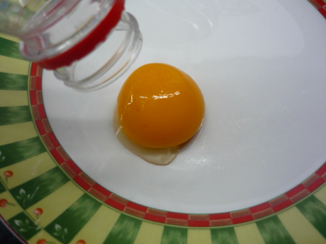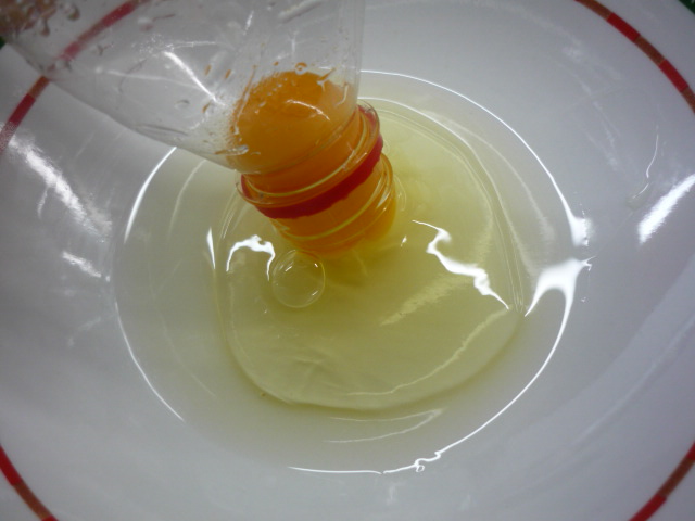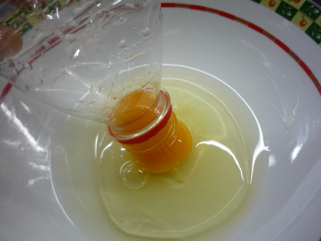 4.-Separamos dos claras de huevo, para ello vamos a utilizar una botella de agua pequeña, la cual apretamos para que succione la yema del huevo que previamente hemos puesto en un plato. (ver fotos) este sistema es muy práctico y lo vi en un video chino hace tiempo. Lo que no inventen los chinos!!!