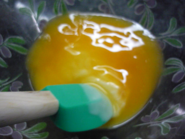 3.- Mezclamos la leche condensada y el zumo de las mandarinas. Añadimos la gelatina diluida y seguimos moviendo para que mezcle todo.