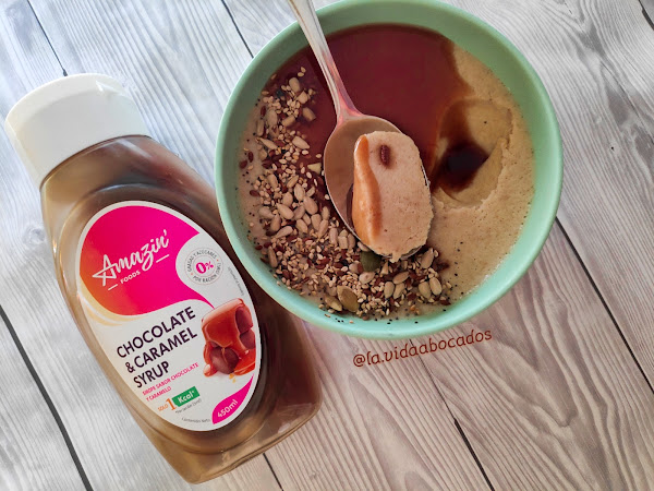 De toppings, yo me decidí por una mezcla de semillas (las de mercadona) y un poco de sirope de chocolate y caramelo de Amazin Foods sin calorías y sin azúcar. Te dejo el enlace aquí por si te gusta. A mí este sabor me tiene enamoradita.