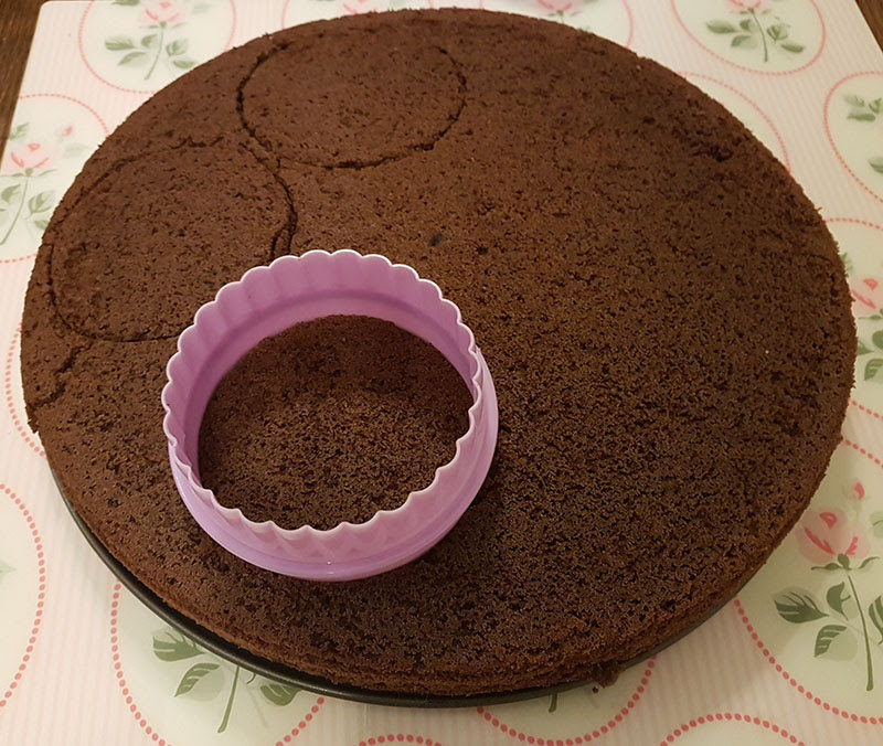 Cortamos el bizcocho en círculos, que serán la base de la mouse. Yo usé cortadores de galleta, pero se puede usar cualquier otra cosa circular, como un vaso.