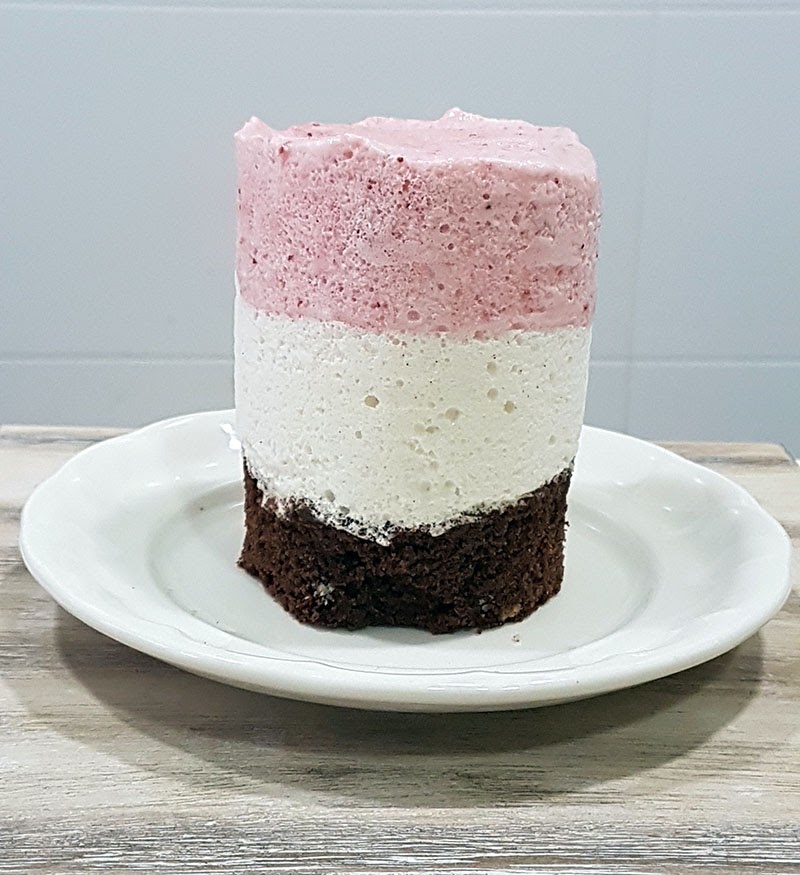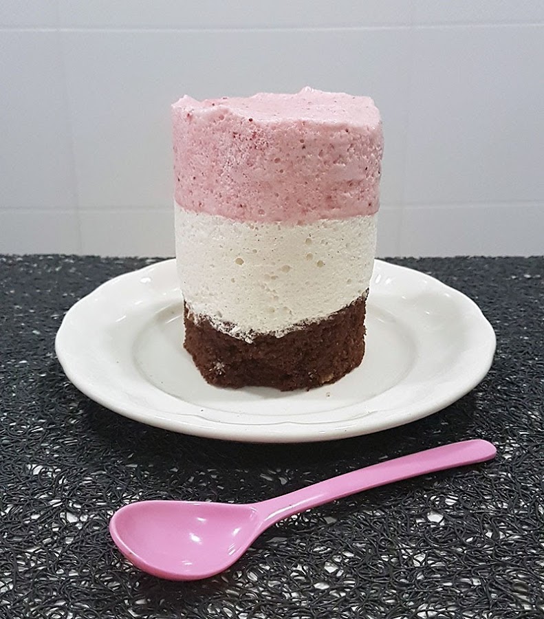 Desde el principio tenía bastante claro que quería hacer algo con mouse. Pero como ando cuidando la línea no quería hacer algo super engordante. Así que aunque he visto algunas recetas con una pinta de muerte, al final me he decidido por quitar la mouse de chocolate y poner de base un bizcocho de chocolate. La mouse de vainilla y la de fresa son con yogur y sin nata (crema de leche). No nos vamos a engañar...de dieta no es, pero tampoco es la bomba calórica de la receta que más me dio de ojo cuando estuve mirando qué hacer.