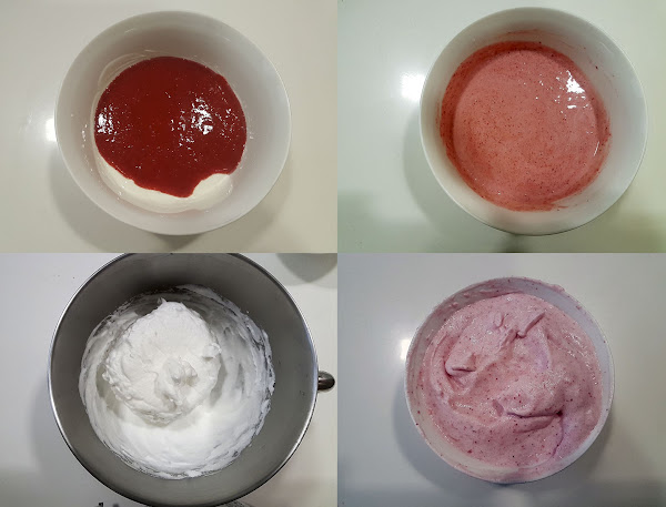 Agregamos las claras a la mezcla de fresas y removemos con ayuda de una espátula, realizando movimientos envolventes hasta obtener una mezcla homogénea. Ponemos parte de la mousse de fresa sobre la mousse de vainilla y volvemos a meter en la nevera hasta que cuaje.