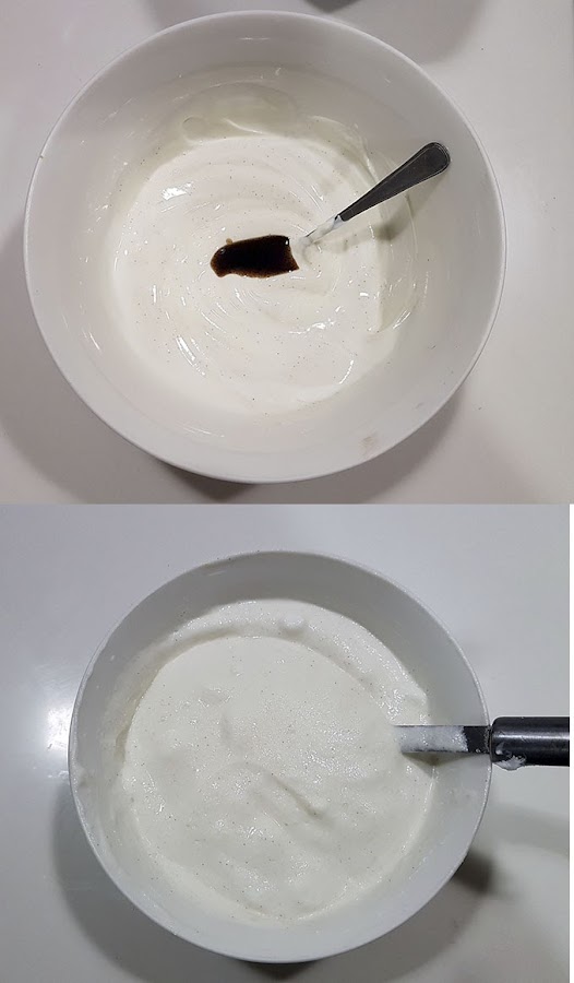 En un cuenco ponemos el yogur con la mitad del azúcar y la vainilla. Removemos bien hasta tener todos los ingredientes bien integrados.
