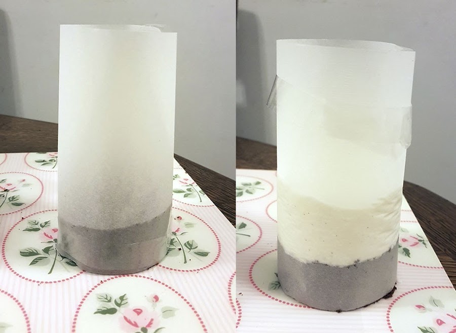 Hacemos un cilindro con papel de cocina y rodeamos la base del bizcocho. Yo le puse bastante cello porque si no, al echar la mouse pierde la forma con facilidad. Lo más adecuado sería usar acetato pero en mi caso no tenía y después de la odisea de buscar las fresas, no andaba con muchas ganas de ponerme a buscar por Bilbao algún sitio donde lo vendieran.