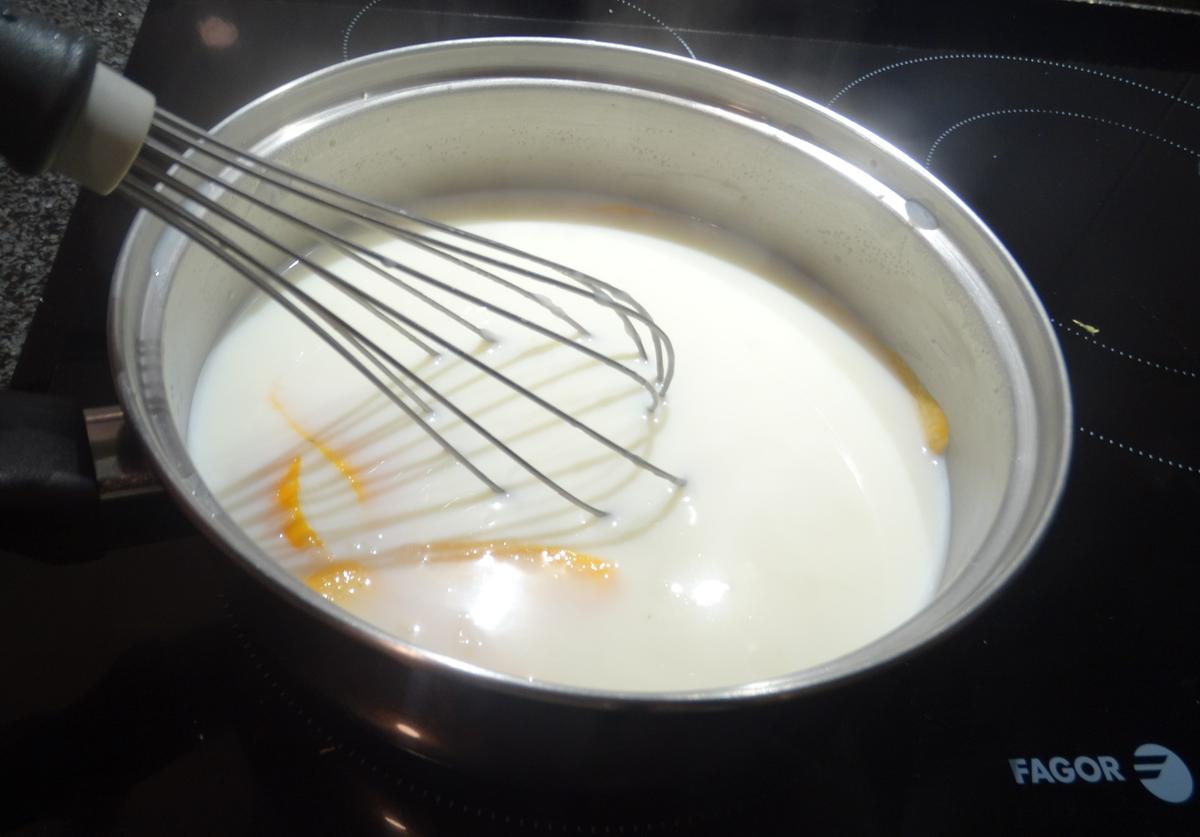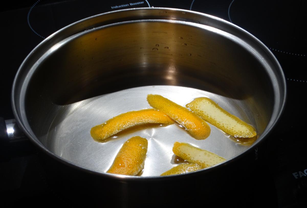 La elaboración no puede ser más sencilla. Lo primero que haremos será poner un poco de agua (algo menos de un vaso) a calentar en una cazuela con la mitad de las peladuras de la naranja.