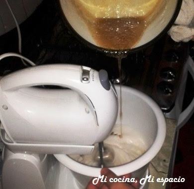 El segundo paso es batir las claras a punto de nieve y agregar el almíbar en forma de hilo... con cuidado que quema!!.
