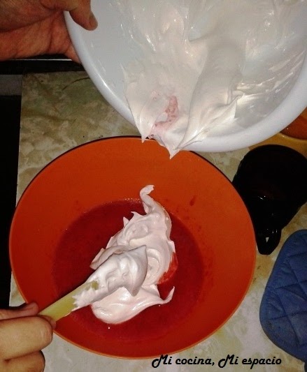 Ahora solo falta mezclar la pulpa, el merengue, la crema y la gelatina que ya la tenía previamente hidratada (la hice siguiendo las instrucciones del sobre). Siempre con moviemientos envolventes.