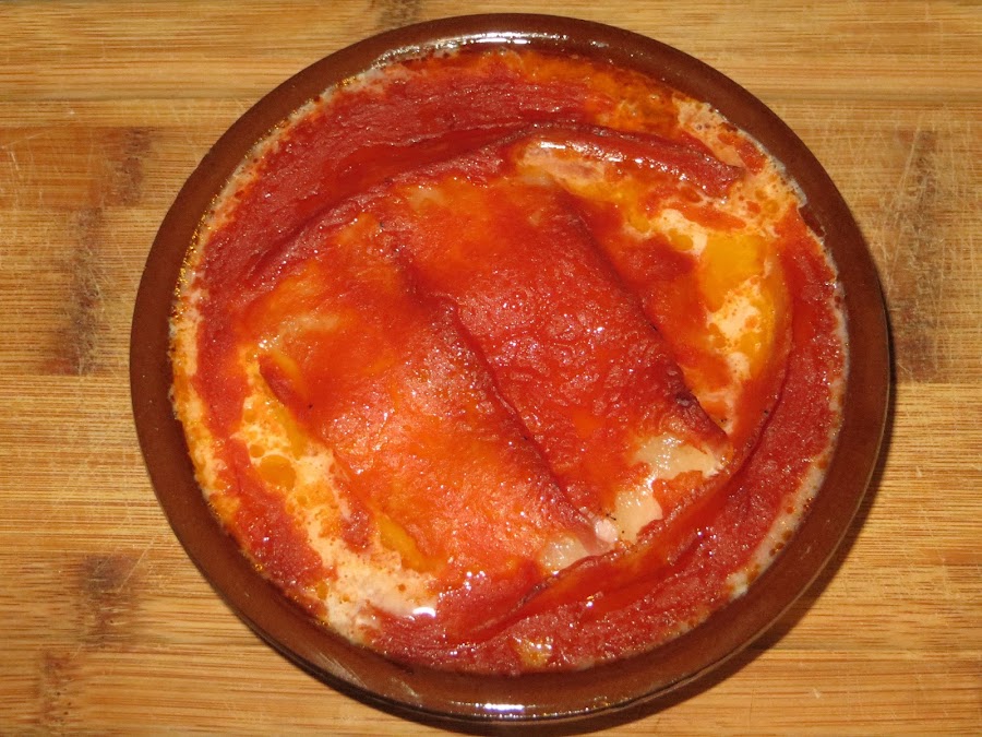 La ponemos en una cazuela apta para horno y le añadimos el tomate por encima, horneamos 15 minutos a 210º y ya está lista para servir. No os olvidéis de comprar gran cantidad de pan y de esperar a que se enfríe un poco si no queréis quemaros la lengua.
