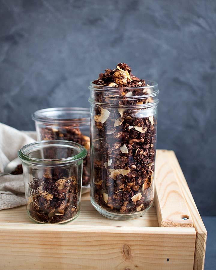 La receta de este muesli con chocolate es igual de sencilla y fácil que el resto de granolas que ya tenéis en el blog. Si sois unos asiduos de las granolas caseras o si tenéis ganas de hacer vuestra primera granola en casa os recomiendo 100% probar este muesli con chocolate, receta saludable.