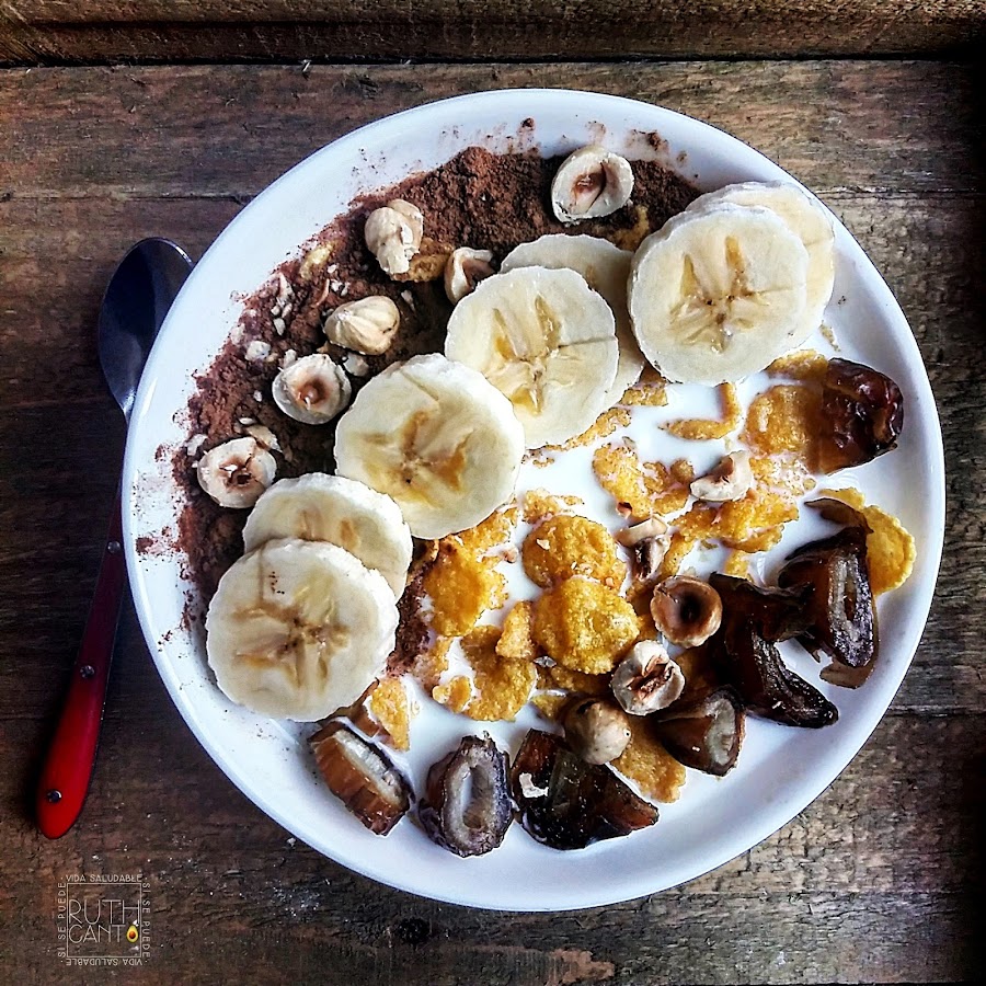 Echo los cereales primero, luego pelo la fruta, deshueso los dátiles y los pongo por encima de forma bonita por que comer por la vista es fundamental, luego troceo las avellanas y espolvoreo la canela.