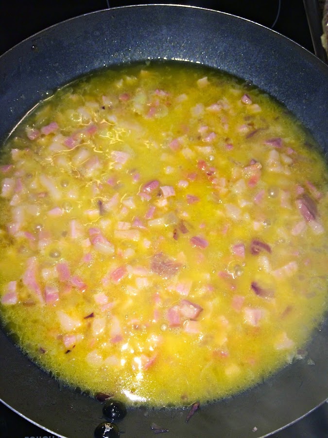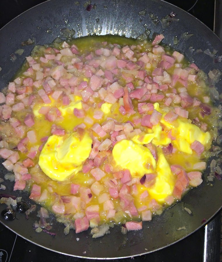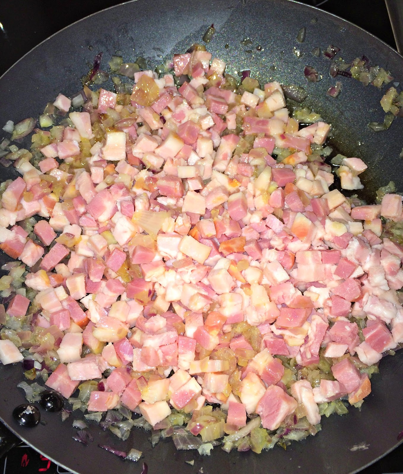 Mientras se pocha la cebolla a fuego medio, vamos picando el bacon, en mi caso, si lo compráis ya picado, añadirlo cuando la cebolla esté transparente.