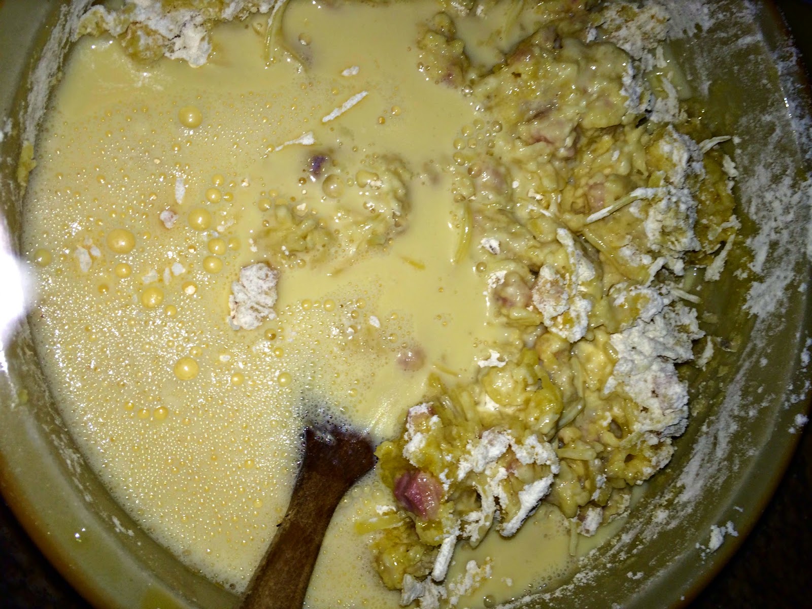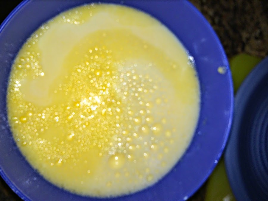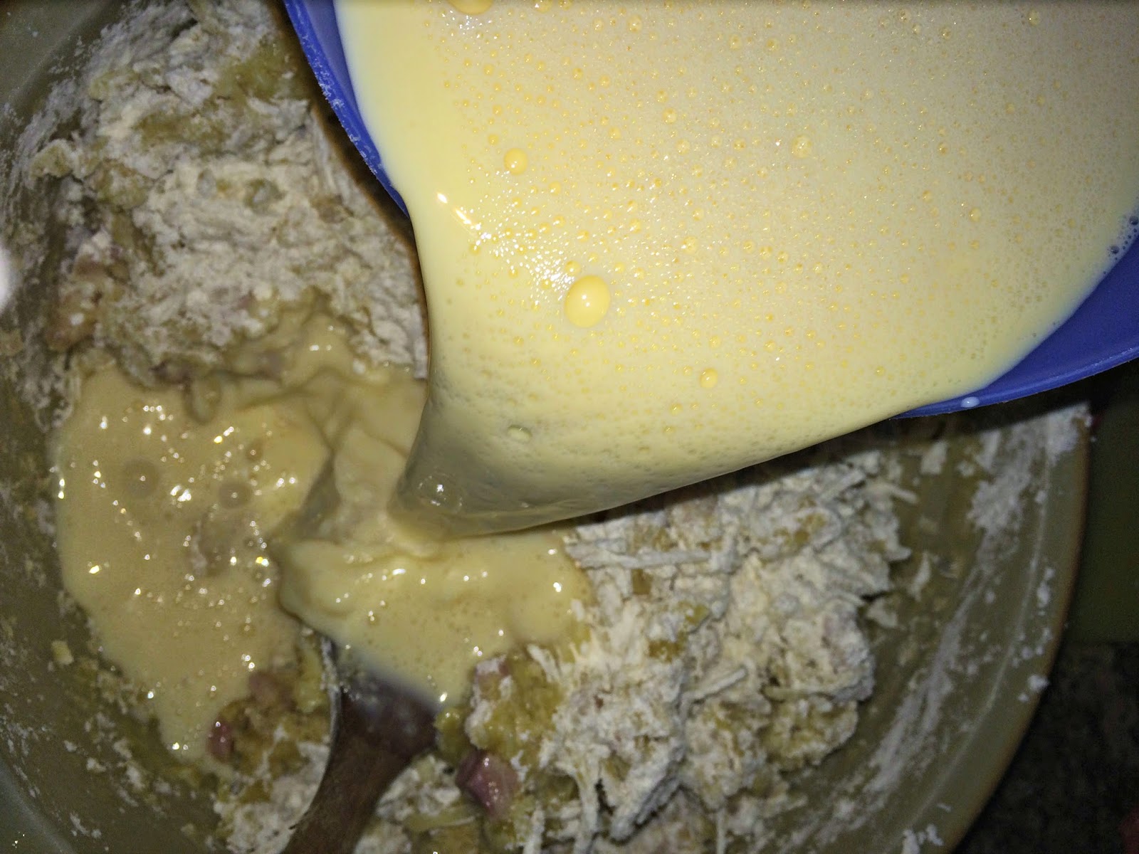 En el momento en que esté derretida, apagamos el fuego y lo volcamos en el bol de la harina. En un bol batimos 1 huevo y lo mezclamos con el vaso de leche, lo añadimos al bol removiendo muy bien para que se mezclen bien todos los ingredientes y nos quede una masa homogénea.