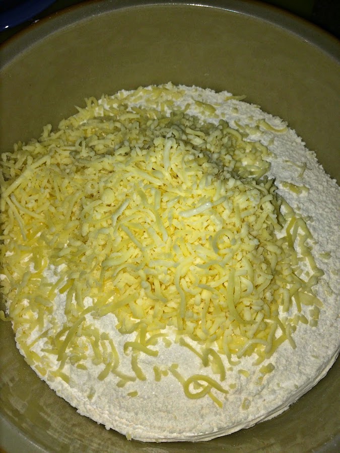 Dejaremos que el bacon se vaya haciendo tranquilamente en la sartén. Mientras vamos a ir mezclando el queso rallado con la harina, desmenuzándolo bien con las manos para que se integre del todo y no se apelotone.