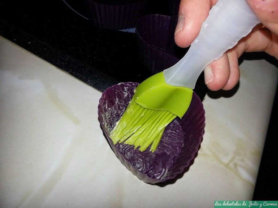 Precalentamos el horno a 180º arriba y abajo (en el momento de meter los muffin, dejaremos solo la resistencia de abajo). Untamos los moldes con un poco de mantequilla y los dejamos preparados encima de la bandeja del horno.