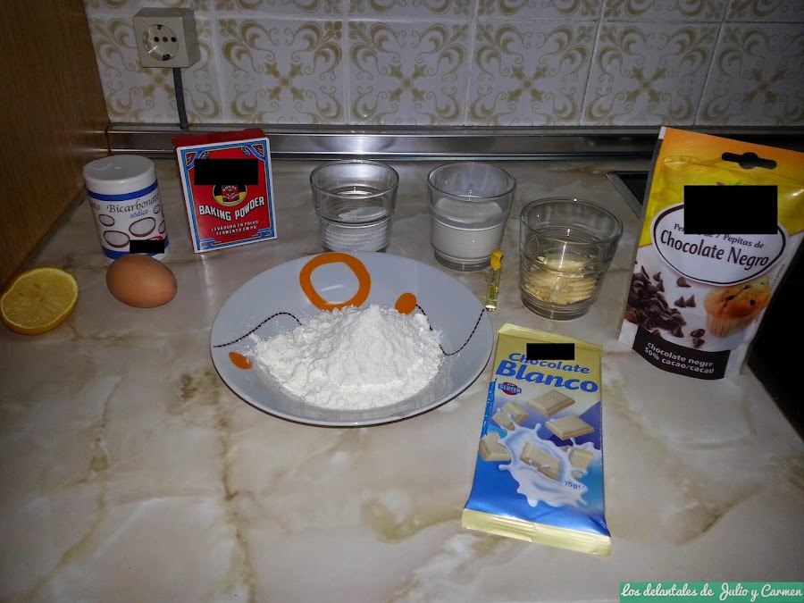 Chips de chocolate blanco y chocolate negro (podéis usar ya bolsas con chips de chocolate, o bien, partir una tableta en trozos)