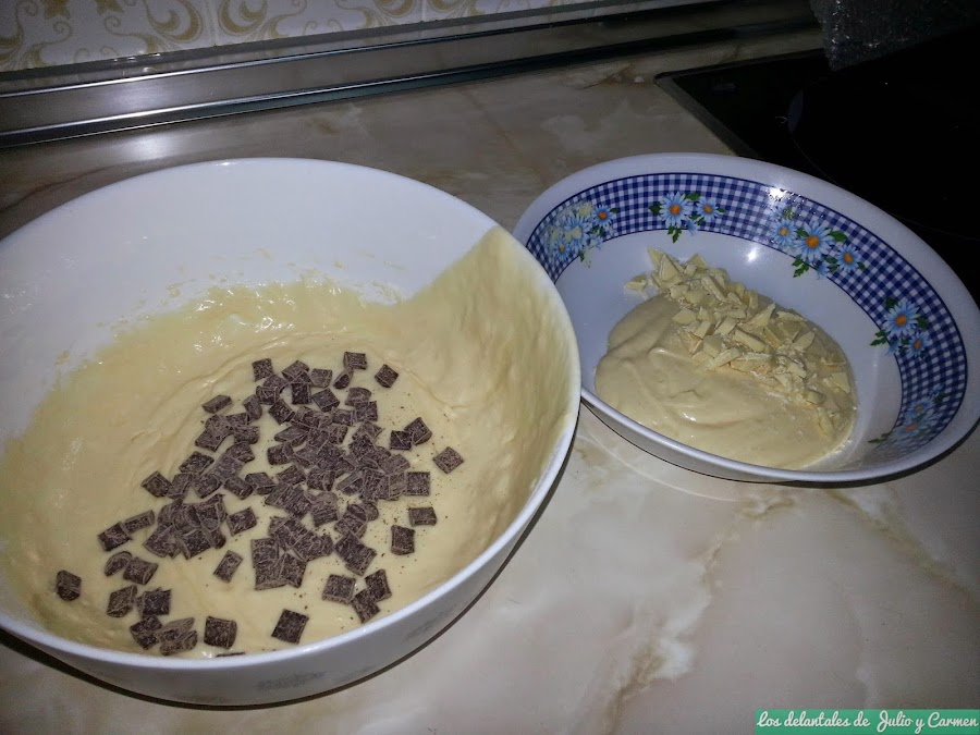 Llegados a este punto podemos optar por varias vías. Yo voy a contar como lo hicimos nosotros, pero también os contaremos posibles variaciones que podéis realizar: Separaremos la masa obtenida en dos partes mas o menos iguales, y verteremos sobre una, chips de chocolate blanco, y sobre la otra chips de chocolate negro (la cantidad de chocolate lo dejo a vuestra elección, dependiendo de lo mucho que os guste el chocolate). Removeremos bien cada mezcla para que se distribuya bien los trozos de chocolate.