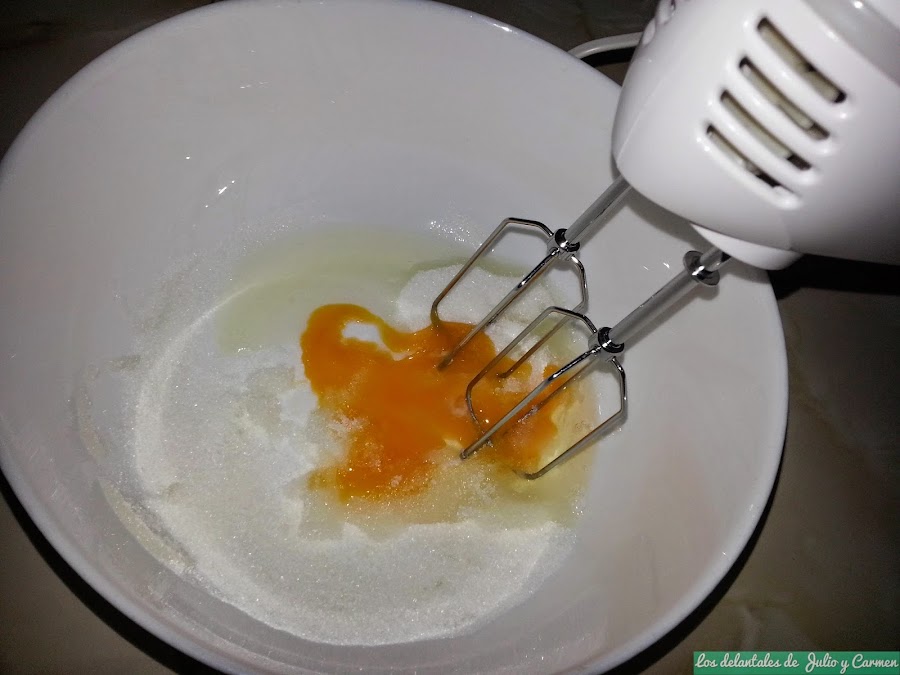 Batimos el huevo junto con el azúcar. Cuando ya tengamos una mezcla espumosa, uniremos a la mezcla unas gotas de limón, el aroma de vainilla, la nata (crema de leche) y la mantequilla derretida. Continuamos batiendo hasta integrar bien todos los ingredientes.