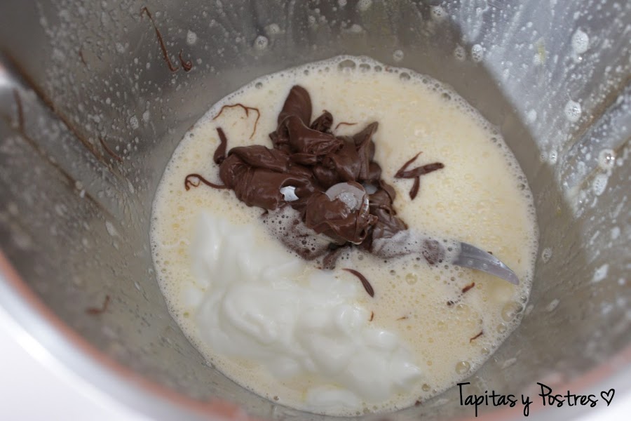 Mezclamos bien los huevos con el azúcar y añadimos el yogur y la nutella.