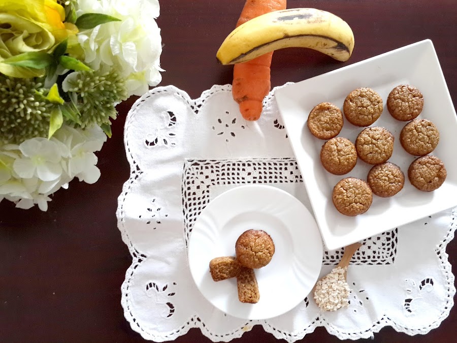 Lo primero es si no tienen harina de avena, poner la avena en la licuadora hasta obtenerla y reservar, agregar el huevo a la licuadora y doblar el tamaño agregar el guineo, canela, vainilla, aceite y la miel dejar que esto se una muy bien, luego agregar la harina el bicarbonato y la zanahoria hasta obtener una masa espesa y homogénea, repartir e la mezcla en la bandeja para muffin hornear por 18 min a 350F, dejar enfriar y sacarlos y disfrutarlo.
