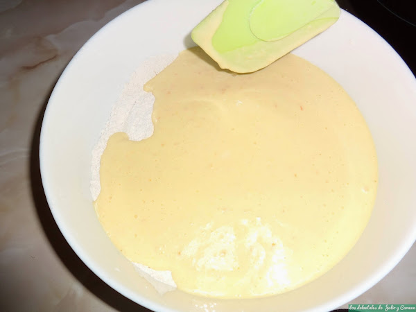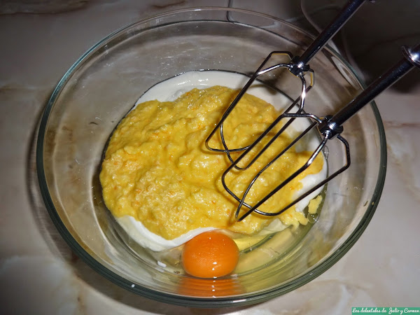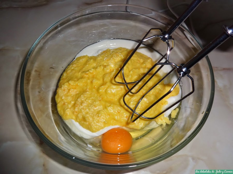 Batimos los huevos, el puré de naranja y los yogures en otro bol hasta obtener una masa homogénea. Si vemos que nos queda muy espeso, podemos verter las cucharadas de leche para aligerarlo un poco.