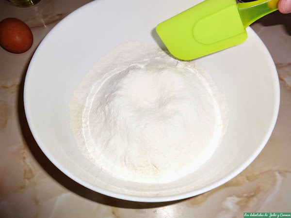 Uniremos los ingredientes secos (harina tamizada, levadura y azúcar) en un bol, removiendo para que se mezclen bien. Reservamos.