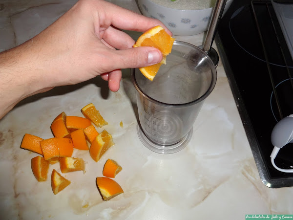 Lavamos y partimos la naranja en trozos, incluida la piel (le quitaremos la base y un poco de la parte superior) y lo trituraremos todo en el vaso de la batidora junto con el aceite de girasol, obteniendo un puré.