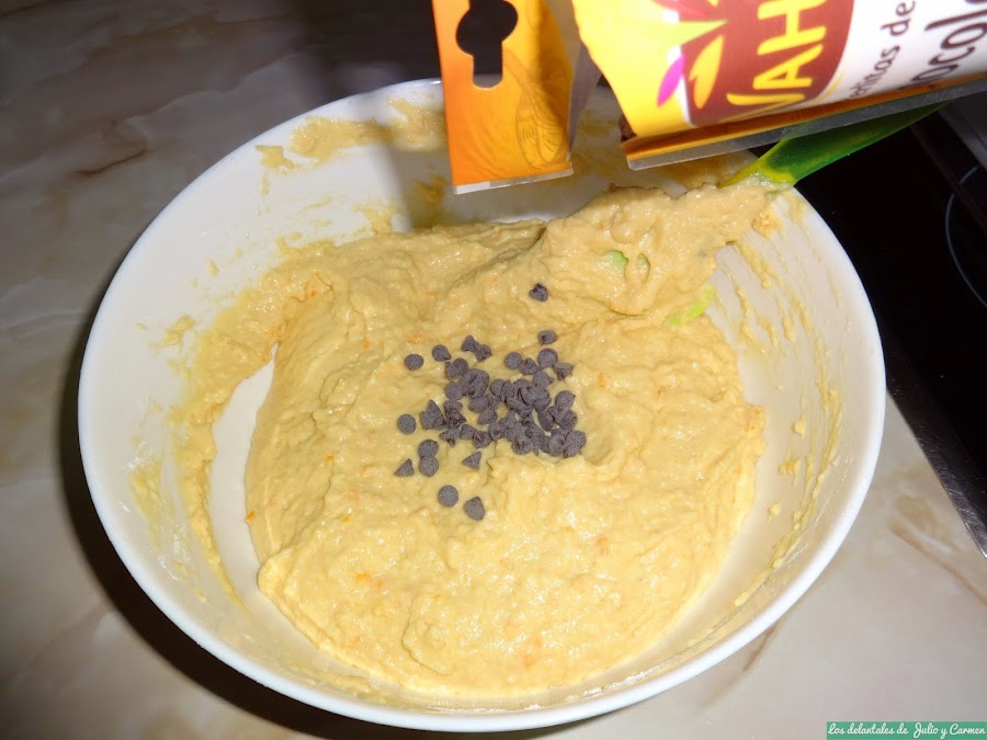 Cuando tengamos la masa preparada, echamos los chips de chocolate y removemos un par de veces para que se distribuyan. Otra opción era unir los chips de chocolate a los elementos secos descrito en el punto 1.