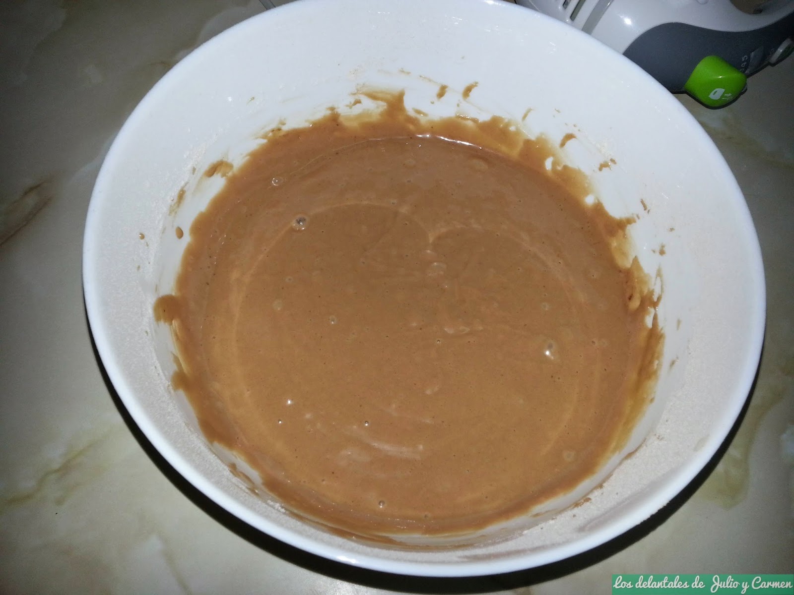 Vertemos en la mezcla el cacao y la harina tamizada junto con la levadura poco a poco. Continuamos batiendo hasta formar una masa sin grumos.