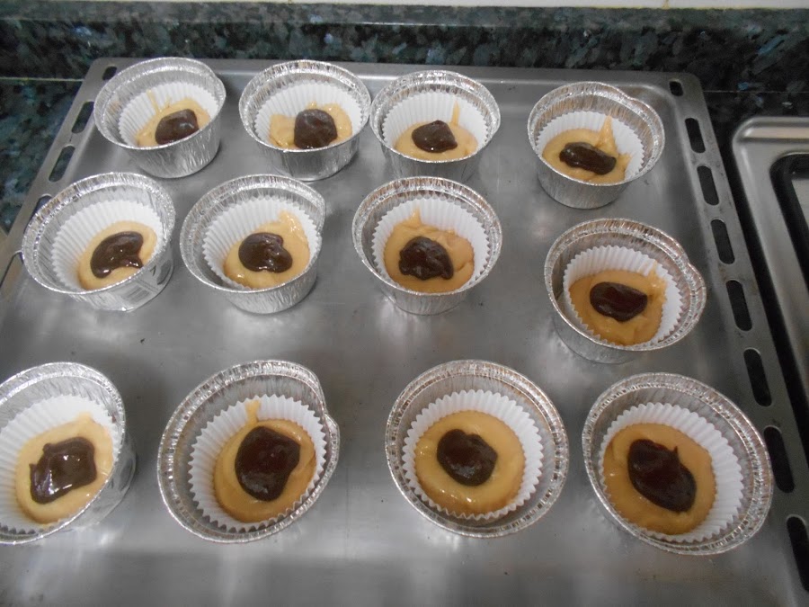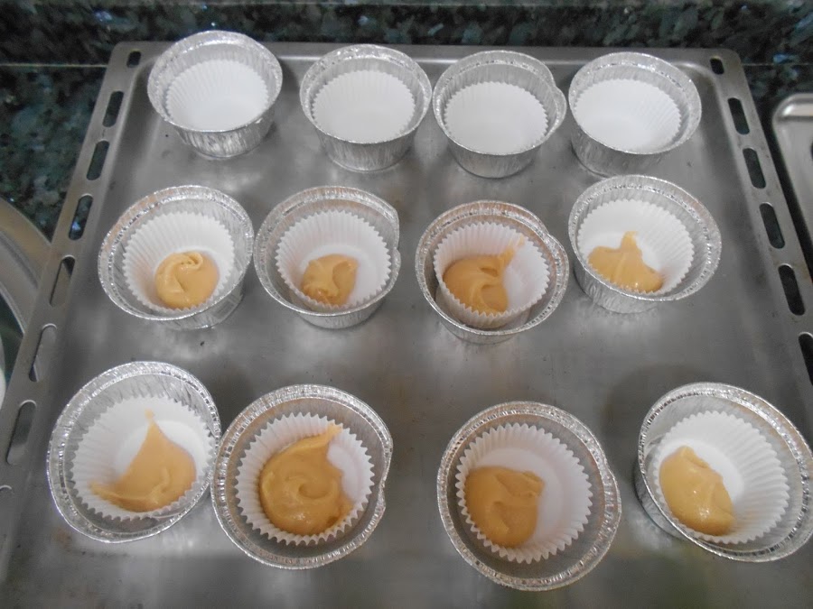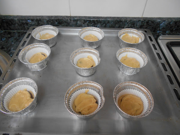 Cogemos porciones de masa con ayuda de unas cucharillas y rellenamos 1/3 del tamaño de la capsula de los muffins.
