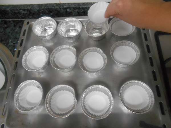 También preparamos las cápsulas de muffins en la bandeja. Yo las pongo dentro de moldes de aluminio.