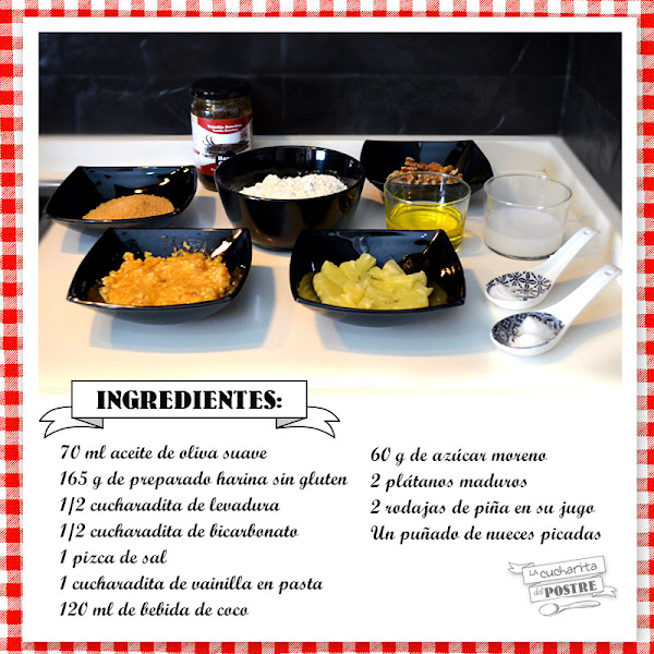 Para los ingredientes vas a necesitar: 60 g de harina sin gluten, 50 g de azúcar moreno, 2 cucharadas de coco rallado, un puñado de nueces trituradas y 70 g de margarina.