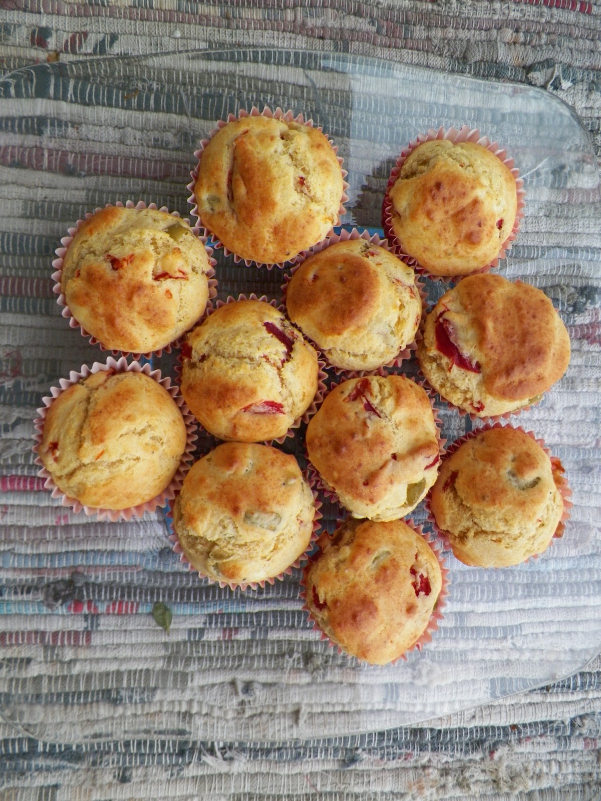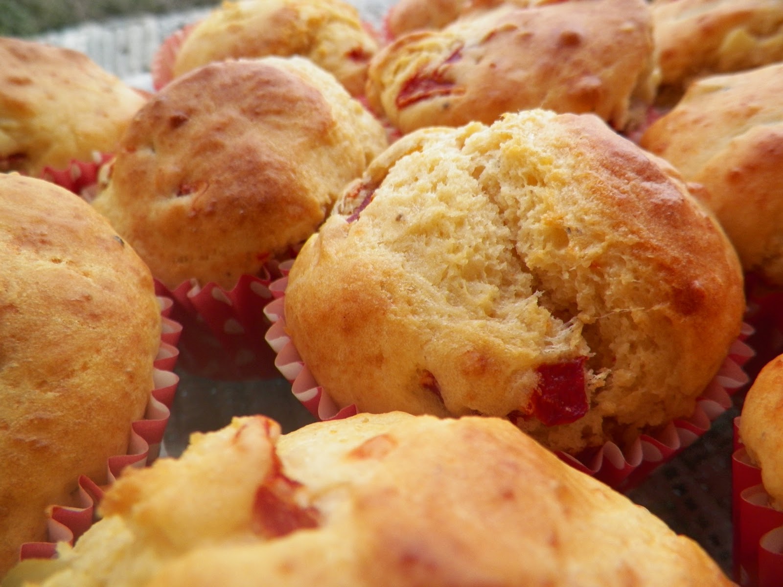 Mezcla la harina, la levadura, la sal y la pimienta. Agrega la leche, el huevo y el aceite hasta que queden bien mezclados e integrados. Añade los pimientos cortados, las aceitunas y el queso feta rallado. Espolvorea el queso parmesano. Hornea durante 20 minutos hasta que los muffins hayan subido y estén dorados.