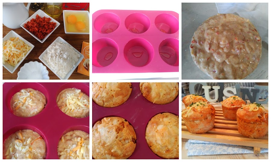 El resultado un bocado entre Muffins y bollos preñados.Tremendamente deliciosos que recomiendo comerlos recién sacados del horno cuándo el queso aún está fundido y el chorizo tierno.