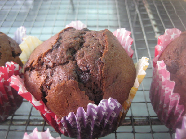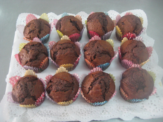 Trocear el resto del chocolate, 80 gr. en pedacitos pequeños y lo añadimos a la mezcla repartiéndolo con la ayuda de una cuchara. Calentar el horno 180º vamos rellenando las cápsulas para los muffins. Vertemos con cuidado la masa en cada una de ellas rellenando sólo 2/3 de su volumen total. Hornear durante 20-25 minutos o hasta que al pinchar con un palito este salga limpio. Una vez horneados, dejar los muffins sobre una rejilla hasta que se enfríen.
