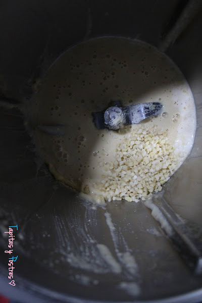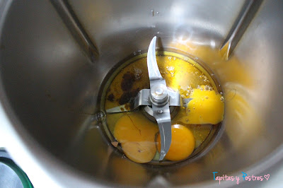 Ponemos los huevos, la miel y la vainilla en el vaso de la batidora o en mi caso, de la thermomix. Batimos 2 minutos a velocidad 4 y medio.