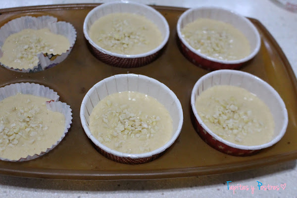 Repartimos la masa en moldes de magdalenas que pondremos sobre un molde rígido o de silicona. Ponemos algunas almendritas picadas encima y horneamos a 180º unos 20 o 25 minutos. Comprobad si están hechos pinchando con un palillo.