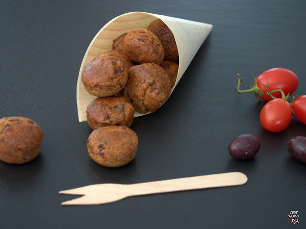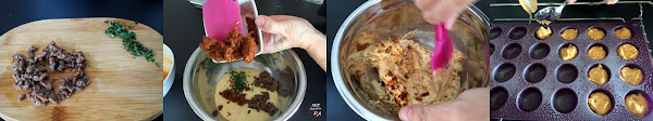 Como la idea es un muffin de aperitivo, hemos elegido unos moldes pequeños de pequeñas semiesferas, de manera que nos queden de un tamaño bocado. Engrasar el molde para que no se nos peguen al desmoldarlos y rellenar con la masa un poco por debajo del borde del molde.
