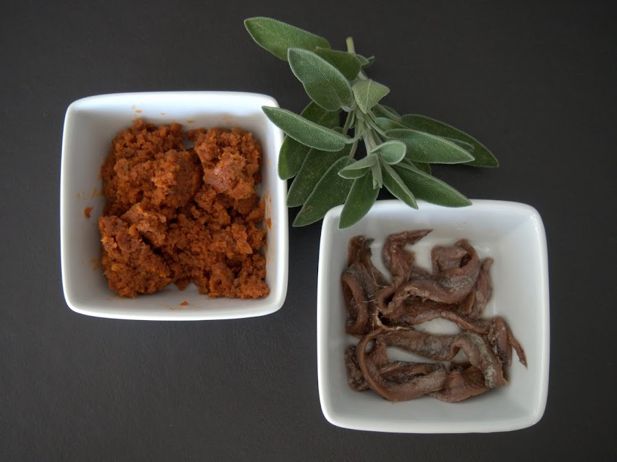 Picar las anchoas y las hojas de salvia e incorporar, junto a la pasta de tomates y olivas, a la masa de harina e integrar bien los ingredientes.