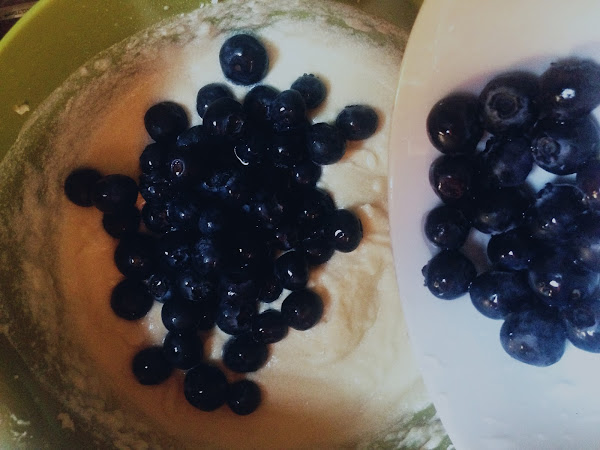 Una vez lista la masa, añadiremos los arándanos con la ayuda de una espátula y revolveremos con cuidado para que no se muelan.