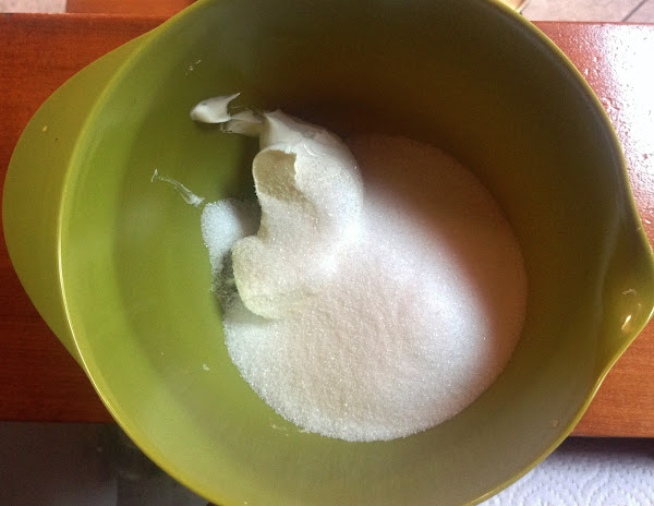 Primeramente, encenderemos el horno, a 190°para que se caliente mientras realizamos la preparación. Luego, en un bowl, mezclaremos la margarina o mantequilla con el azúcar, ayudándonos con la batidora, en este caso usé una eléctrica.