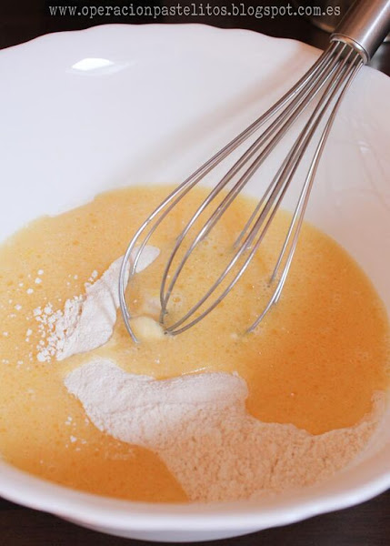 3. Ahora echamos los ingredientes líquidos sobre los ingredientes secos reservados anteriormente y removemos con una cuchara de madera o varilla de mano sin insistir tampoco.