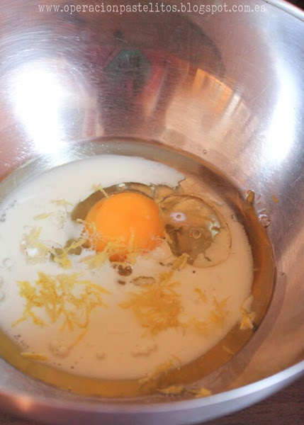 2. En otro bol, mezclamos los ingredientes líquidos: ponemos el huevo a temperatura ambiente junto con el aceite , la leche y la ralladura de limón y removemos con una varilla de mano pero sin insistir demasiado solo para que se integren sin más.