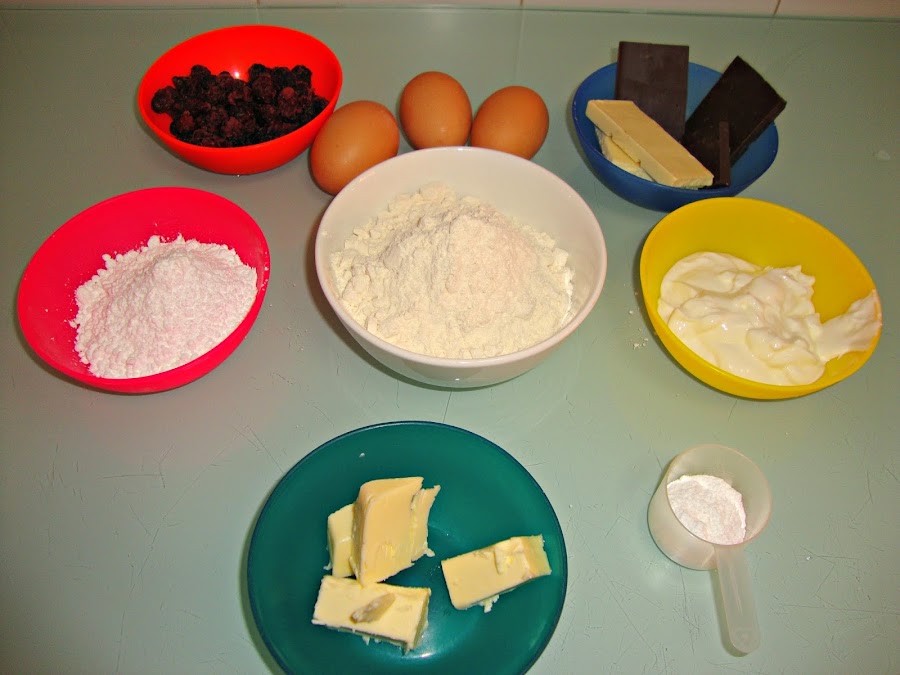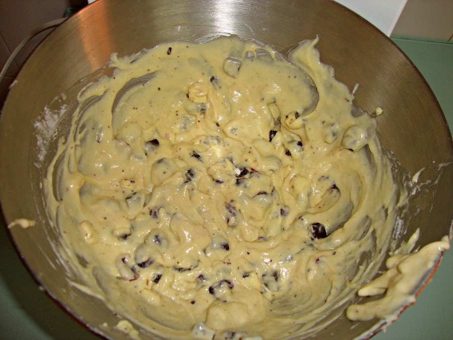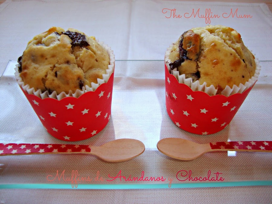 Finalmente añadimos los arándanos y los trocitos de chocolate y repartimos bien por toda la mezcla.