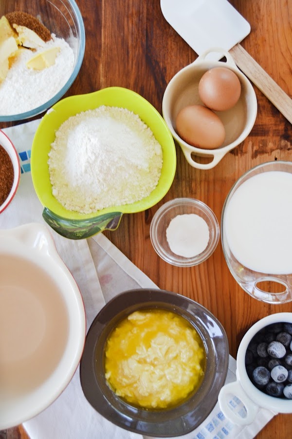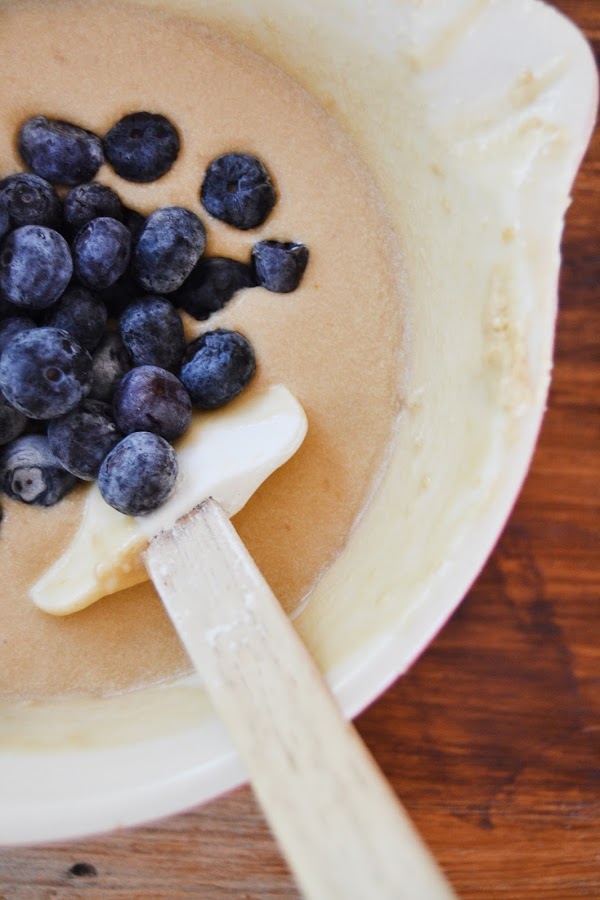 Mezcla la mantequilla con el azúcar hasta que quede una mezcla sedosa. Agrega los huevos y vuelve a batir. Añade la harina tamizada con la levadura y la sal, y vuelve a remover. Añade la leche. Añade los arándanos y vuelve a remover. Reserva.